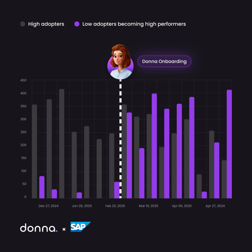 Donna integrates deeply with SAP Sales and Service Cloud (V1 and V2), including custom objects. Setup takes weeks, not months, delivering the fast time-to-value sales teams are craving. Frictionless experience turns low adopters into high performers