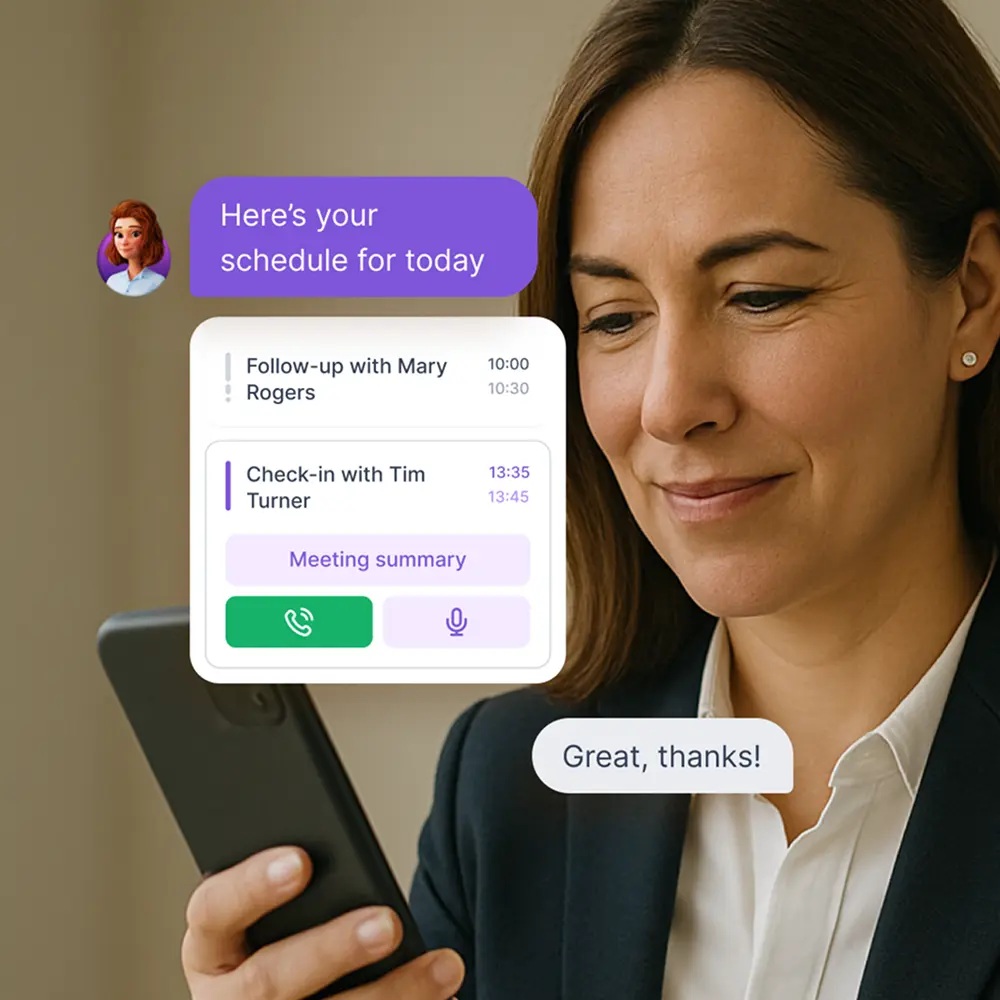 Donna’s purpose is built for field sales. Unlike generic AI assistants, Donna connects with your CRM, captures meeting notes, and updates contacts and opportunities automatically, even on the go. As Donna is deeply integrated into the day-to-day of field sales teams, she delivers a proactive, voice to voice and hyper-personalized experience.
